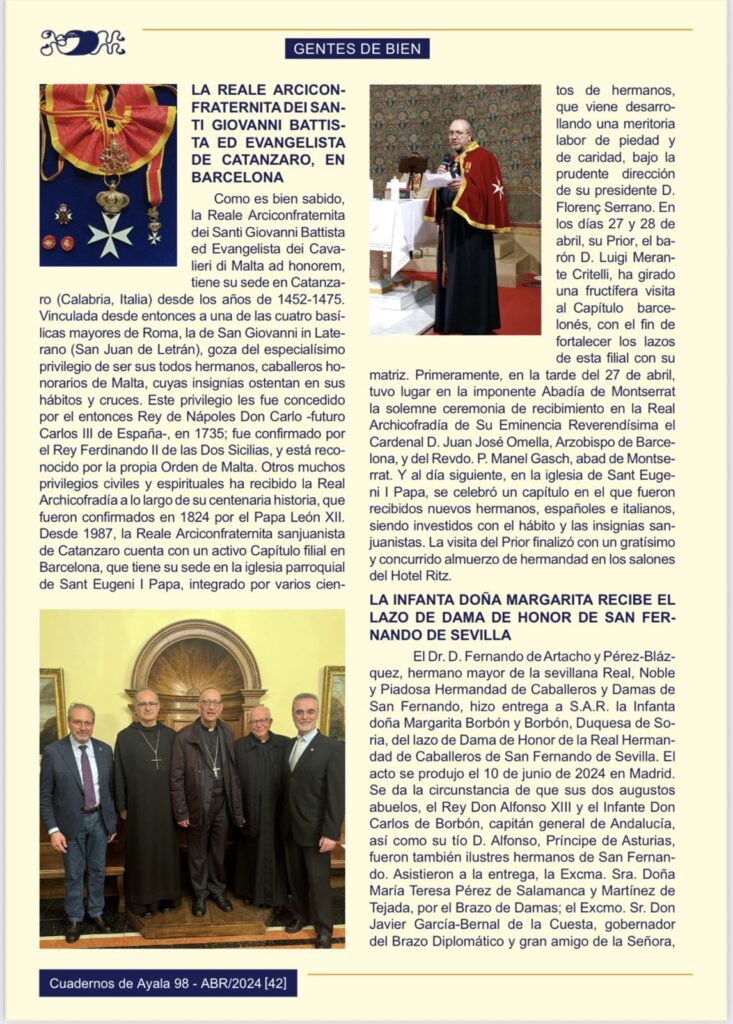 En el marco de su secular misión de servicio a la fe y a la caridad, la Reale Arciconfraternita dei Santi Giovanni Battista ed Evangelista dei Cavalieri di Malta ad honorem, erigida en Catanzaro (Calabria, Italia) entre los años 1452 y 1475 y vinculada desde entonces a la Archibasílica Papal de San Juan de Letrán, reitera su firme presencia en España a través de su Capítulo filial de Barcelona, erigido en 1987, y con sede en la parroquia de Sant Eugeni I, Papa.